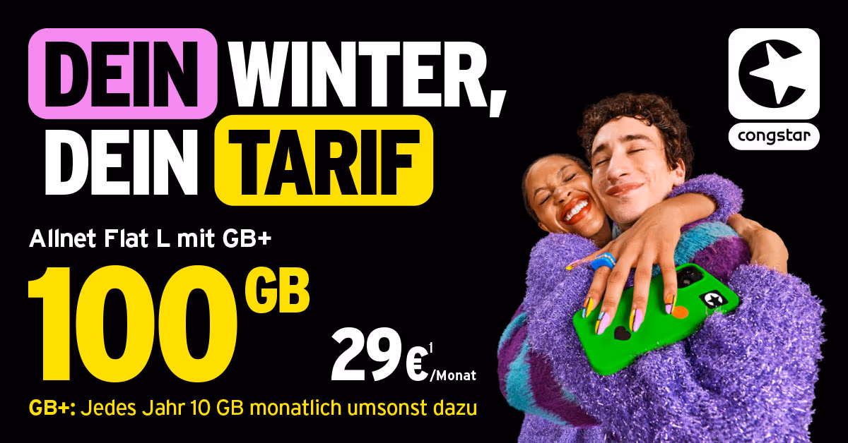 Aktion für Neukunden bei Buchung bis zum 24.02.2026: Die congstar Allnet Flat L mit GB+ kostet monatlich 29 €. Mindestvertragslaufzeit 24 Monate. Einmaliger Bereitstellungspreis 15 €. Die Bandbreite wird ab einem Datenvolumen von 100 GB statt 20 GB im jeweiligen Monat von max. 50 Mbit/s im Download und 25 Mbit/s im Upload auf max. 32 Kbit/s im Download und Upload beschränkt. Voraussetzung für das Surfen im 5G-Netz ist die Verfügbarkeit von 5G am Standort und ein 5G-fähiges Endgerät. Sofern 5G am jeweiligen Standort nicht verfügbar ist, surfst Du mit EDGE/LTE. GB+: Das monatliche Datenvolumen erhöht sich im Tarif Allnet Flat L alle 12 Monate um jeweils 10 GB. Bei Tarifwechsel in einen anderen Tarif gelten die Konditionen des neuen Tarifes. Für jedes Vertragsjahr im bisherigen Tarif erhält der Kunde das GB+ Volumen, welches für den neuen Tarif gilt. Das heißt: GB+ Volumen pro Vertragsjahr im bisherigen Tarif bei Wechsel in die Allnet Flat XS 1 GB, bei Wechsel in die Allnet Flat S 2 GB und bei Wechsel in die Allnet Flat M 5 GB. Der congstar Refresh kostet einmalig 8 € pro Buchung. Der Refresh ist ab Buchung sofort bis zum jeweiligen Monatsende nutzbar, nicht verbrauchtes Datenvolumen verfällt danach. Im Gültigkeitszeitraum steht das Inklusivdatenvolumen des aktuellen Tarifs, mit der jeweiligen im Tarif vereinbarten geschätzten maximalen Übertragungsgeschwindigkeit, zusätzlich zum Inklusivvolumen zu Verfügung. Der Refresh kann beliebig oft gebucht werden. Gültigkeit innerhalb Deutschlands und der Ländergruppe 1 (EU-Ausland). Vertragspartner der Mobilfunkdienstleistung: congstar – eine Marke der Telekom Deutschland GmbH, Bayenwerft 12–14, 50678 Köln.
