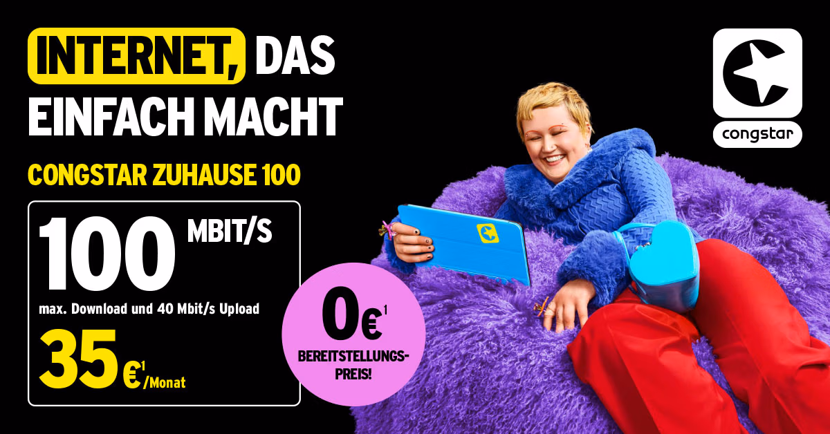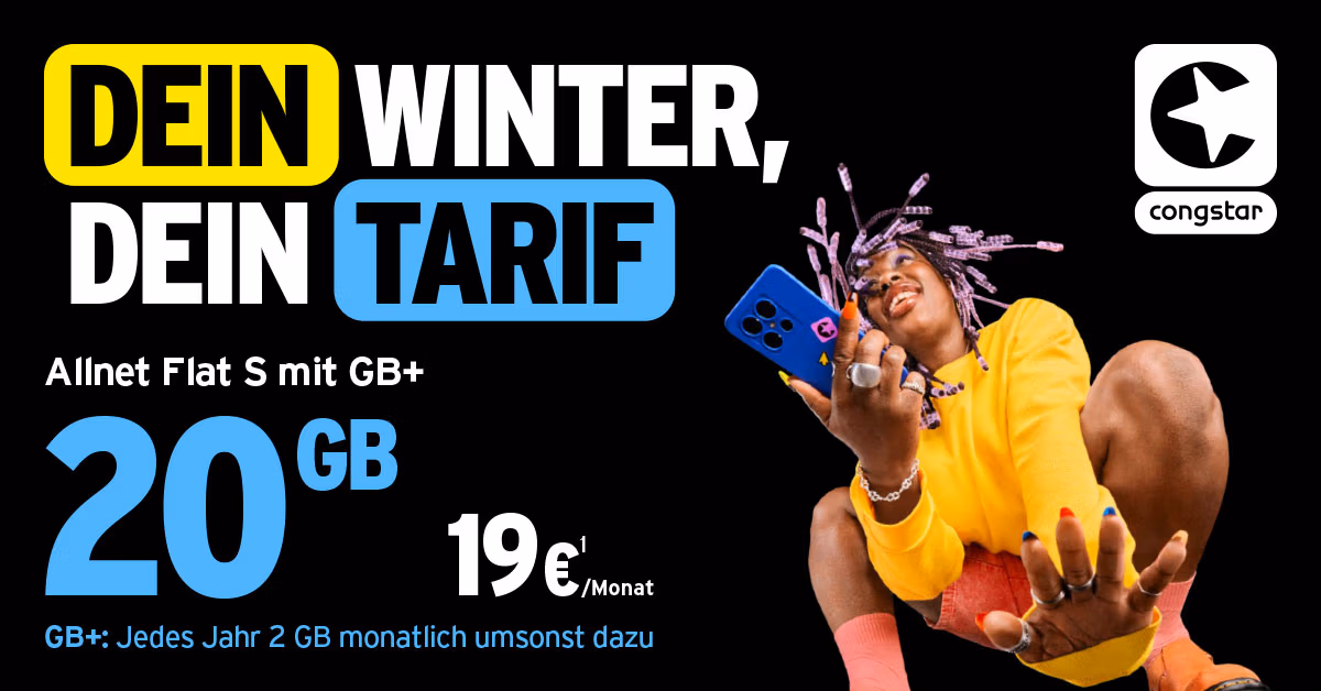 Aktion für Neukunden bei Buchung bis zum 24.02.2026: Die congstar Allnet Flat S mit GB+ kostet monatlich 19 €. Mindestvertragslaufzeit 24 Monate. Einmaliger Bereitstellungspreis 15 €. Die Bandbreite wird ab einem Datenvolumen von 20 GB statt 10 GB im jeweiligen Monat von max. 50 Mbit/s im Download und 25 Mbit/s im Upload auf max. 32 Kbit/s im Download und Upload beschränkt. Voraussetzung für das Surfen im 5G-Netz ist die Verfügbarkeit von 5G am Standort und ein 5G-fähiges Endgerät. Sofern 5G am jeweiligen Standort nicht verfügbar ist, surfst Du mit EDGE/LTE. GB+: Das monatliche Datenvolumen erhöht sich im Tarif Allnet Flat S alle 12 Monate um jeweils 2 GB. Bei Tarifwechsel in einen anderen Tarif gelten die Konditionen des neuen Tarifes. Für jedes Vertragsjahr im bisherigen Tarif erhält der Kunde das GB+ Volumen, welches für den neuen Tarif gilt. Das heißt: GB+ Volumen pro Vertragsjahr im bisherigen Tarif bei Wechsel in die Allnet Flat XS 1 GB, bei Wechsel in die Allnet Flat M 5 GB und bei Wechsel in die Allnet Flat L 10 GB. Der congstar Refresh kostet einmalig 8 € pro Buchung. Der Refresh ist ab Buchung sofort bis zum jeweiligen Monatsende nutzbar, nicht verbrauchtes Datenvolumen verfällt danach. Im Gültigkeitszeitraum steht das Inklusivdatenvolumen des aktuellen Tarifs, mit der jeweiligen im Tarif vereinbarten geschätzten maximalen Übertragungsgeschwindigkeit, zusätzlich zum Inklusivvolumen zu Verfügung. Der Refresh kann beliebig oft gebucht werden. Gültigkeit innerhalb Deutschlands und der Ländergruppe 1 (EU-Ausland). Vertragspartner der Mobilfunkdienstleistung: congstar – eine Marke der Telekom Deutschland GmbH, Bayenwerft 12–14, 50678 Köln.